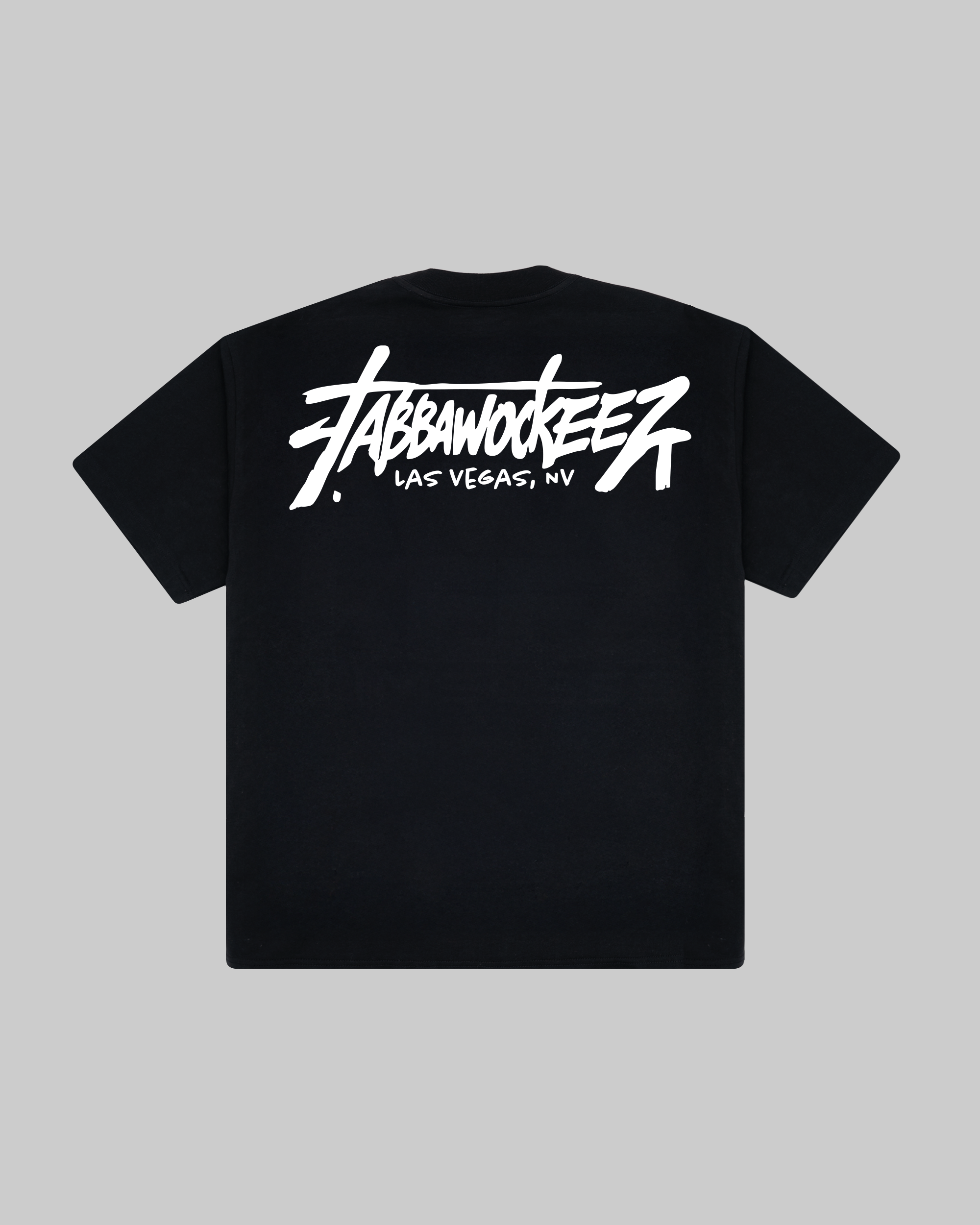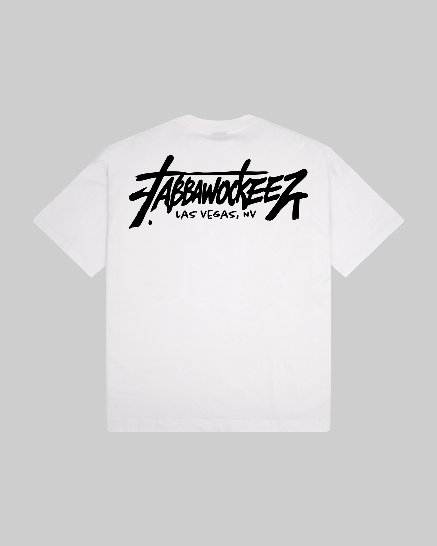 This Script Tee in white  is crafted from 100% cotton for breathable comfort and durability. Featuring a black screen-printed "jabbawockeez" logo discreetly placed near the left rib area, it offers a subtle yet stylish nod to Las Vegas, NV.